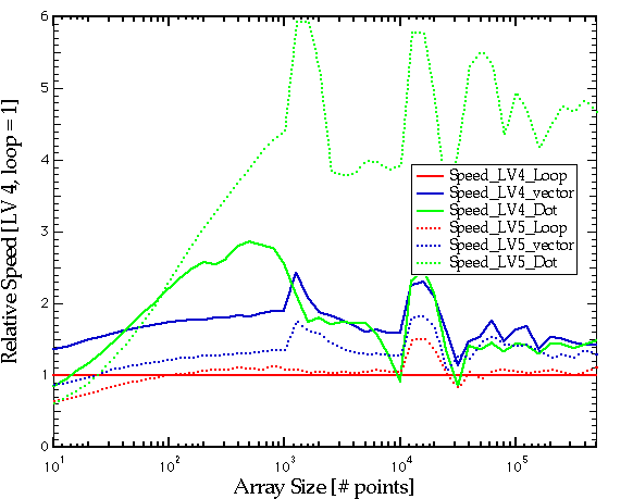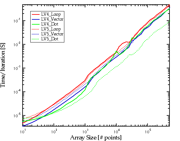 Note that the dot product has substantially been improved in LV 5. Overall it appears that LV 5 is faster than LV 4 for this operation. The built in dot product function is the fastest method as one would expect.