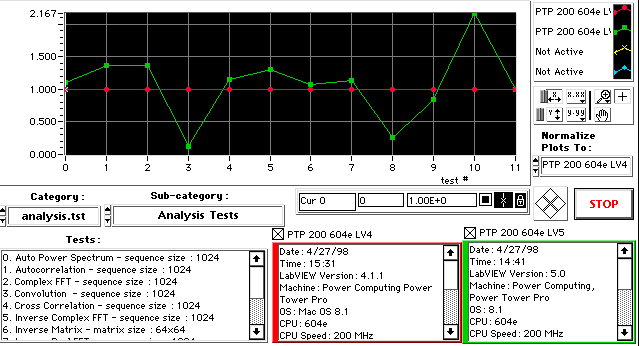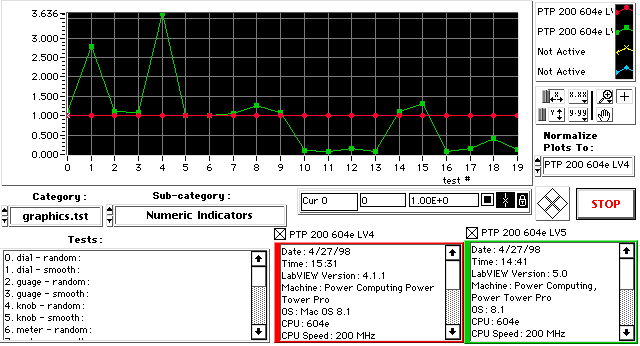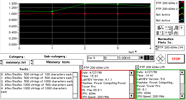 In this case the only interesting comparison is the relative speed of the benchmarks under LV5 compared to LV4. These compare the same VIs on the same machine under similar circumstances. I attempted to have my Mac in identical states for two tests.