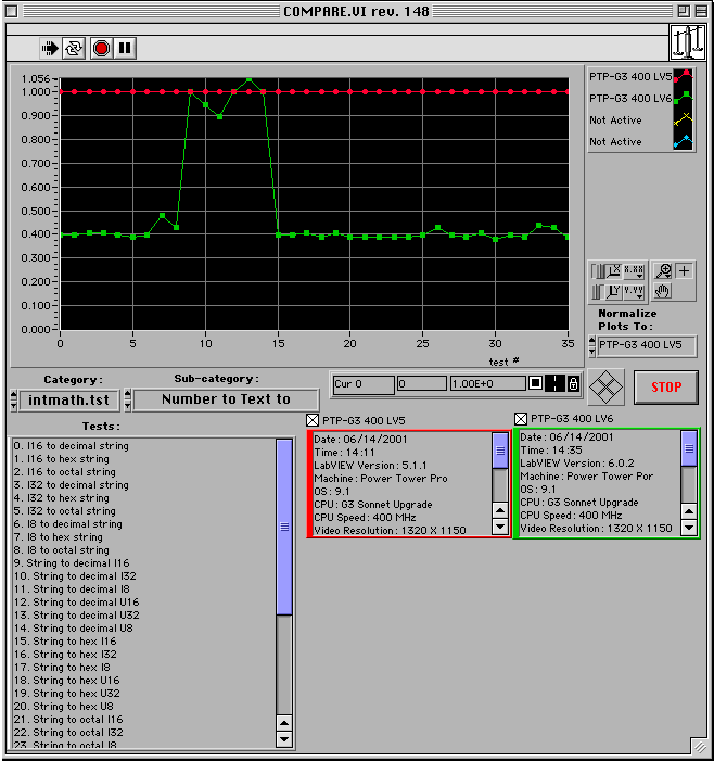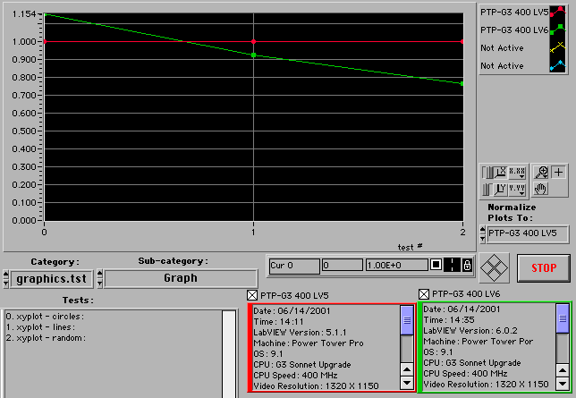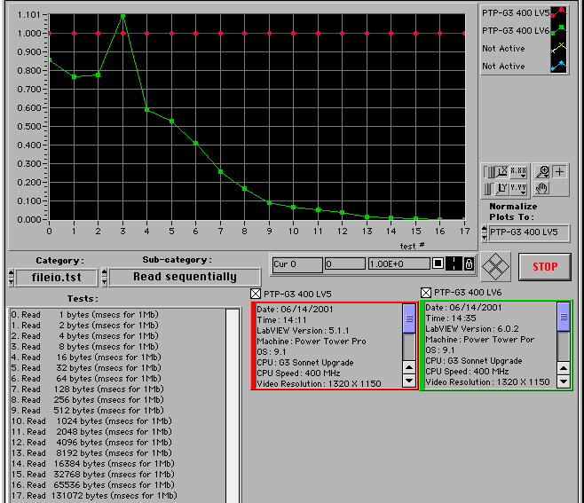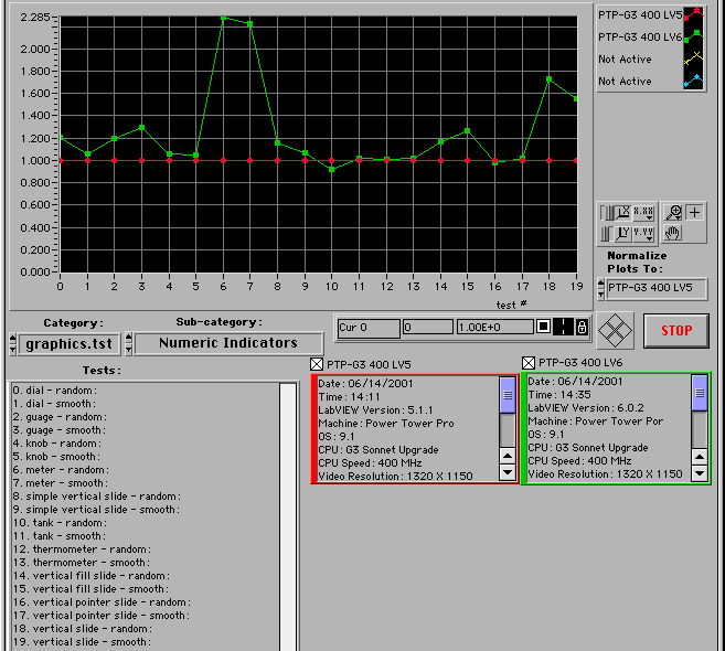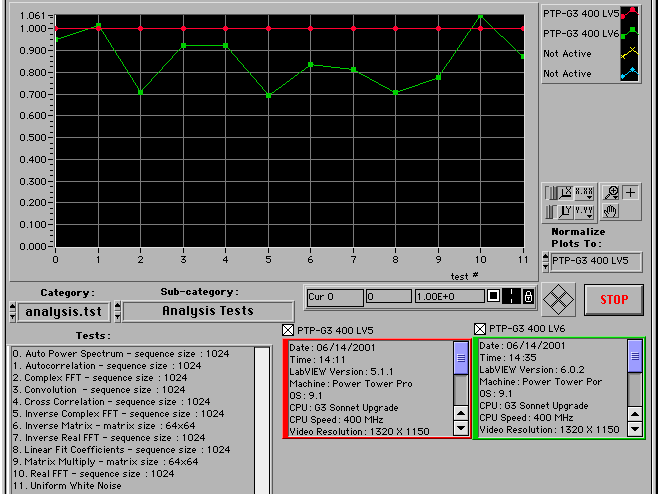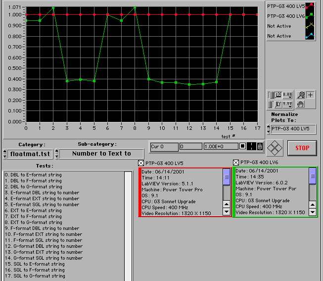 In this case the only interesting comparison is the relative speed of the benchmarks under LV 6.0.2 compared to LV5.1.1. These compare the same VIs on the same machine under similar circumstances. I attempted to have my Mac in identical states for two tests.