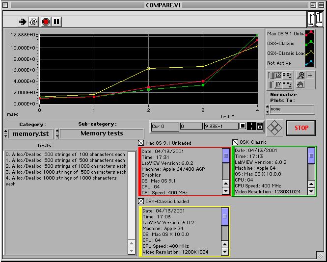 The unloaded Mac OS X had the finder and LabVIEW though there was a background web server and other system tasks. The Mac OS 9 only had the finder and LabVIEW. Even the heavily loaded system had no major slowdowns in speed. The ability of OS X to take advantage of multiple processors is a big win.